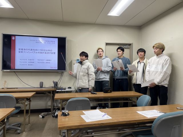 2025/01/10 B4 鬼丸君、二宮君、大田君、村上君が高村准教授から高電圧・電気材料研究室卒業論文発表会での発表に対して表彰されました。