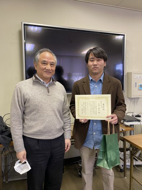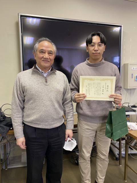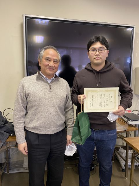 2022/01/31 B4 古川君、小柳君、内田君が花井教授より高電圧・電気材料研究室卒業論文発表会 優秀論文発表賞を受賞しました。