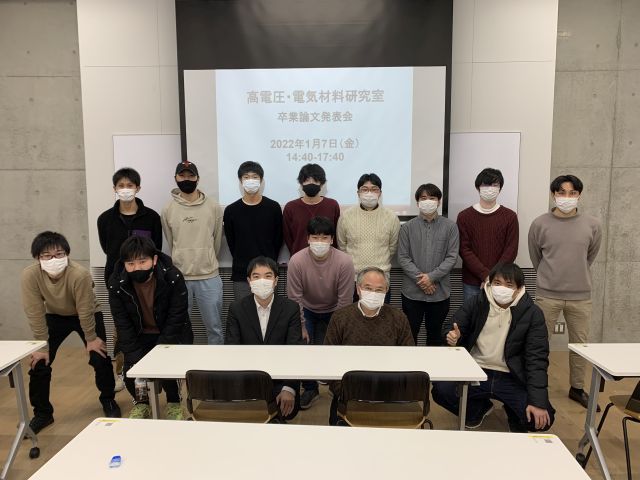 2022/01/07 高電圧・電気材料研究室 令和3年度卒業論文発表会が開催され、卒研生8名 (欠席 1名) が口頭発表を行いました。